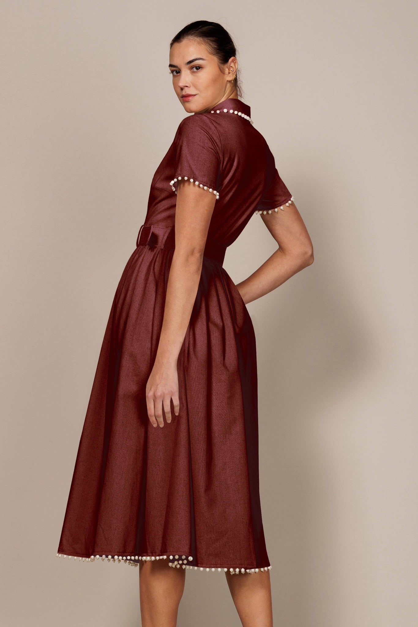 SHORT SLEEVE COLLARED MIDI DRESS WITH PEARL DETAIL